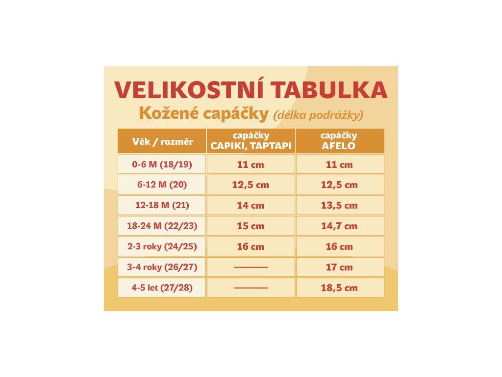 - POZOR ! capáčky různých námi distribuovaných značek se mírně liší v některých velikostech, nakoukněte prosím do tabulky rozměrů. Značka AFELO je vhodnější spíše pro normální až užší, drobnější nožičky, naopak pro buclatější (či vysoký nárt) zase doporučujeme CAPIKI, nebo TAPTAPI (od vel. 2-3 roky se pak rozdíly mezi značkami stírají)